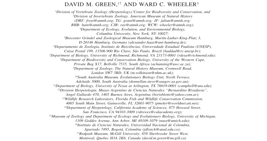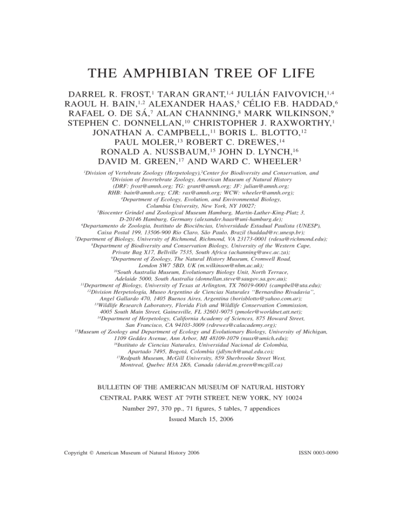 Cita / Citation: Frost, Darrel R., Grant, Taran, Faivovich, Julián, Bain, Raoul H., Raxworthy, Christopher J., & Wheeler, Ward. 2006. The amphibian tree of life. BULLETIN OF THE AMERICAN MUSEUM OF NATURAL HISTORY 297: 370 pp., 71 figures, 5 tables, 7 appendices.