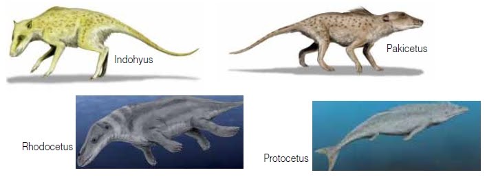 Las ballenas están muy bien adaptadas a la vida marina y han vivido en el océano durante millones de años. Pero como nosotros, son mamíferos, respiran aire y dan a luz a sus bebés. Debido a que los mamíferos se originaron en tierra firme, en algún momento los ancestros de las ballenas debieron moverse desde la tierra hacia el mar. Ahora ya se conocen numerosos fósiles que demuestran esto sin lugar a dudas. Animales fósiles como Indohyus, Pakicetus, Rhodocetus y Protocetus son los ancestros de las ballenas actuales. Comparten muchas características (como la estructura única del oído y del talón), pero poseían patas como las de animales terrestres.