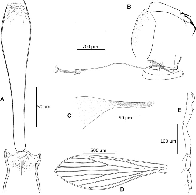 | Imagen 5: Características típicas de Psychodopygus francoisleponti, incluyendo (A) la faringe y el cibarium; (B) genitales masculinos; (C) aedeagus; (D) ala; (E) palpo. Fuente: Zapata et al. 2011 |