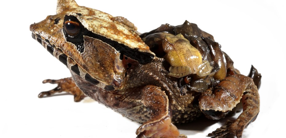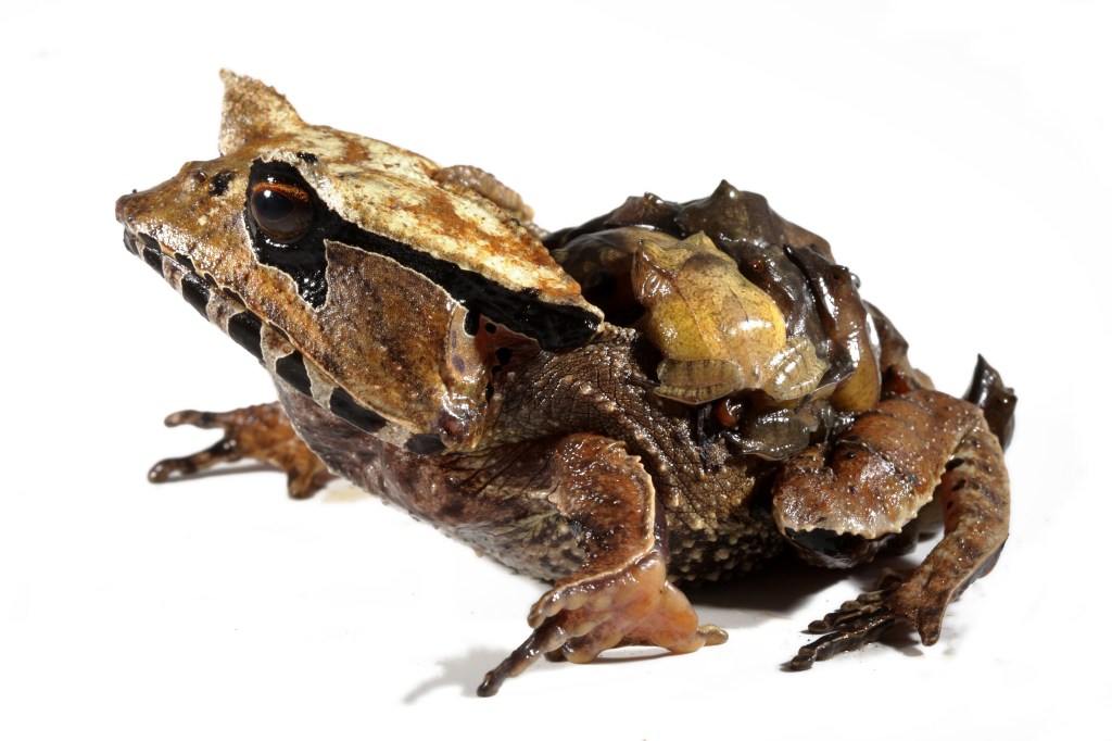 ¡Felíz Día de la Madre! Esta Rana Cornuda es una hembra y está cargando a sus bebés en la espalda. Su nombre científico es Hemiphractus scutatus y habita en la Amazonía.